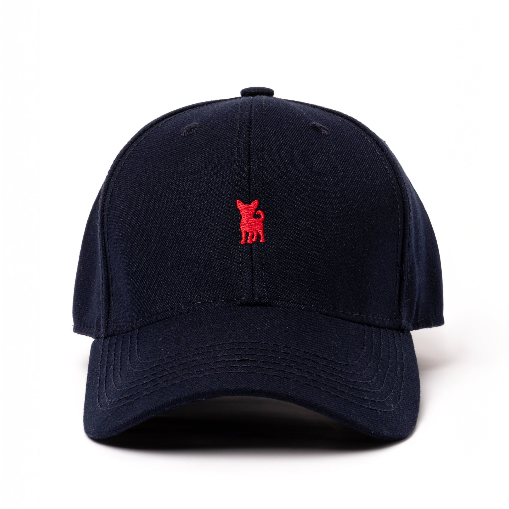 Fondo azul marino con el bordado rojo de la silueta de un Chihuahua que aporta un aire atrevido. Diseño clásico de seis paneles, visera curva y ajuste trasero que se adapta a todas las tallas. Perfecta para quienes buscan un toque urbano y divertido, y quieren presumir su pasión por estos pequeños guardianes de gran carácter.